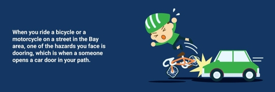 When you ride a bicycle or a motorcycle on a street in the Bay area, one of the hazards you face is dooring, which is when someone opens a car door in your path. If someone suddenly opens their vehicle door while you are riding by, there’s a good chance that you won’t have time to react in order to prevent a dooring accident and getting hurt.