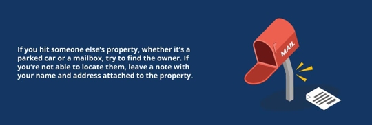 If you hit someone else’s property, whether it’s a parked car or a mailbox, try to find the owner. If you’re not able to locate them, leave a note with your name and address attached to the property.
